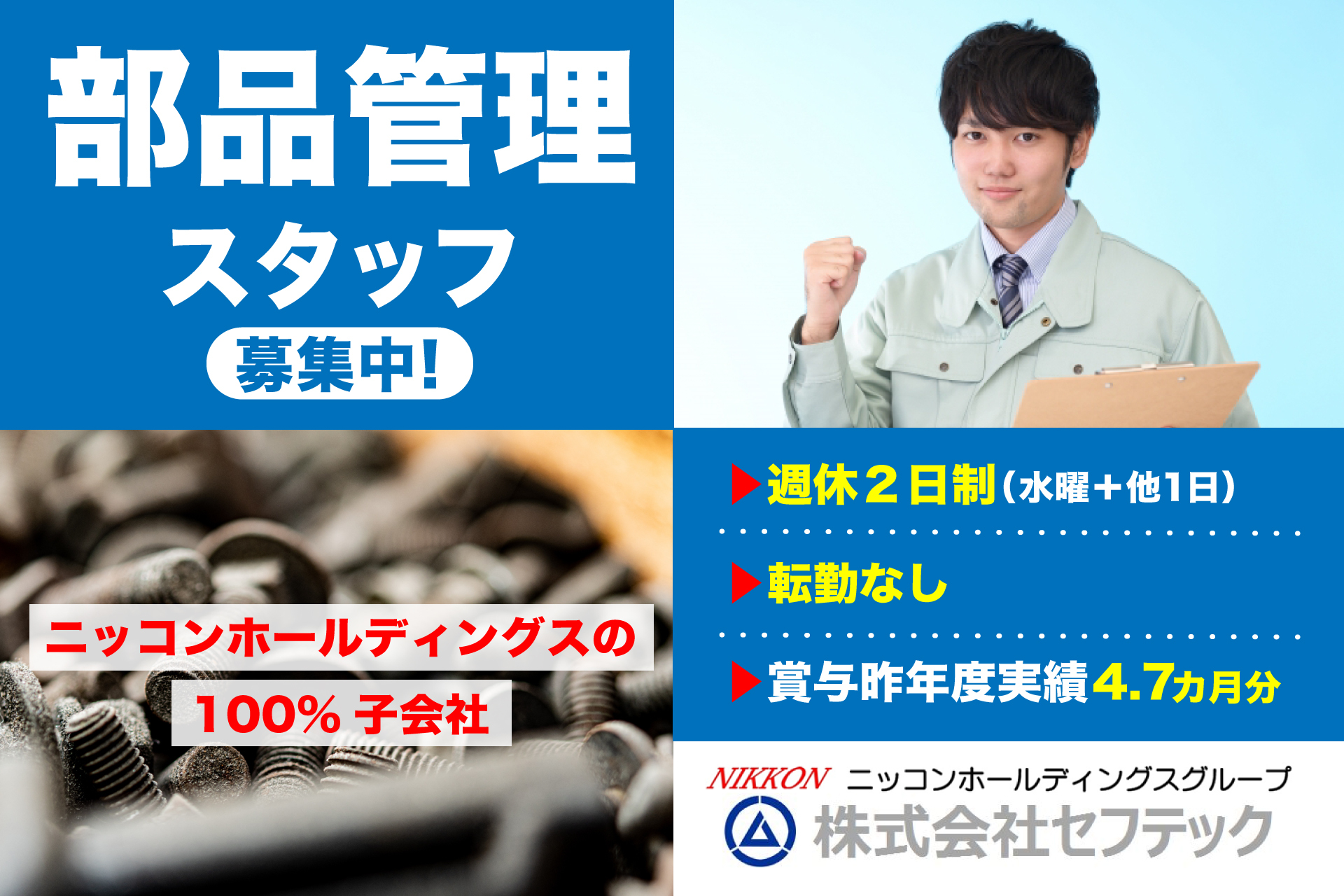 部品管理スタッフ 週休2日制 賞与4.7カ月分 転勤なし 正社員