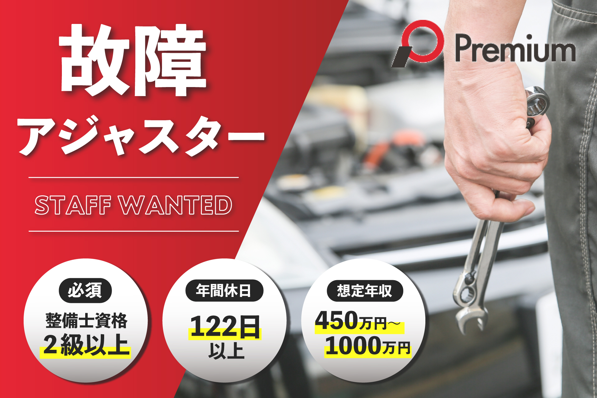 故障アジャスター 2級以上整備士資格必須 年間休日122日以上 正社員