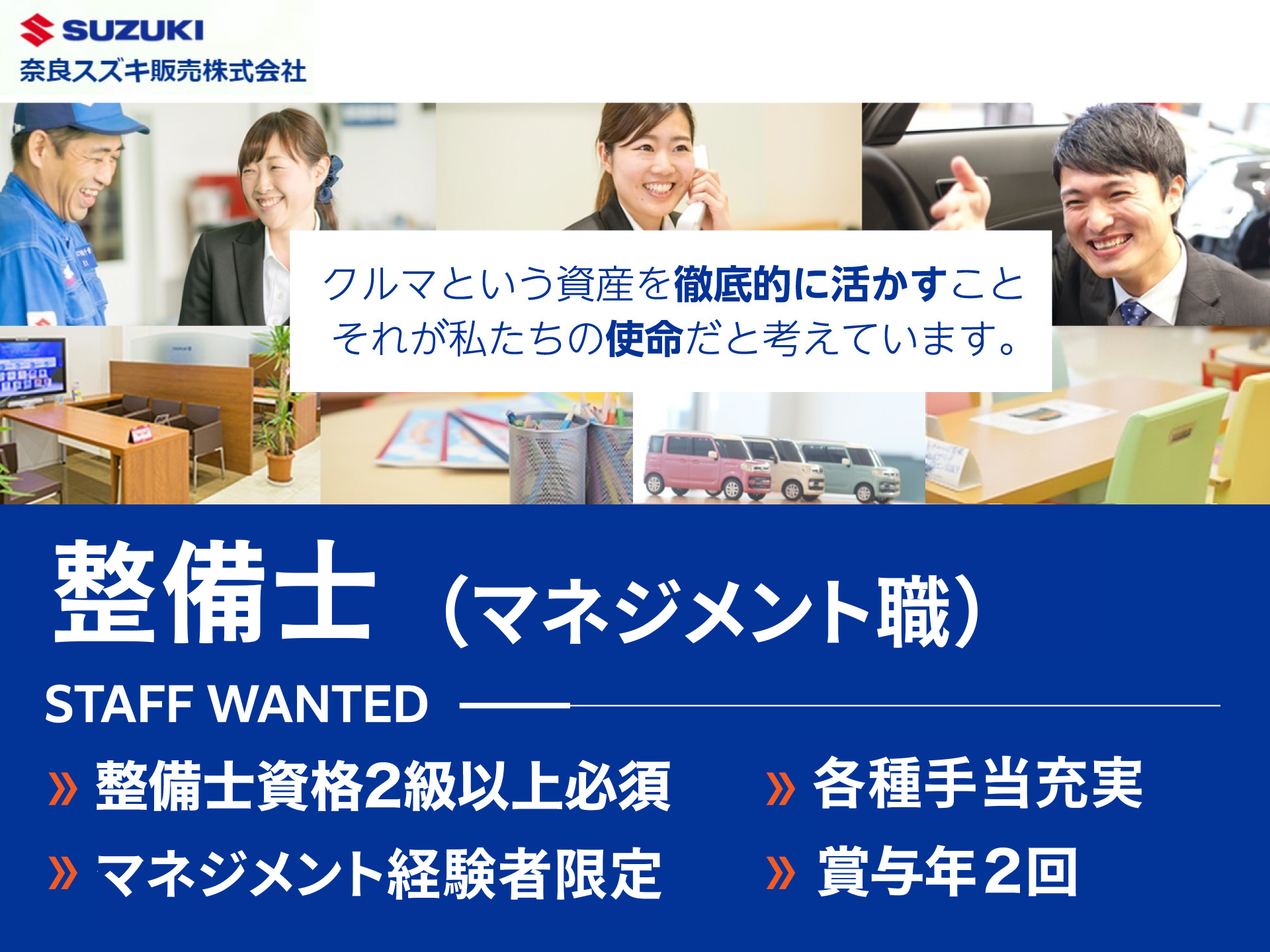 即戦力として、今までの経験やスキルを活かして活躍していただけます。スズキ正規ディーラーで整備士として一緒に働きませんか?