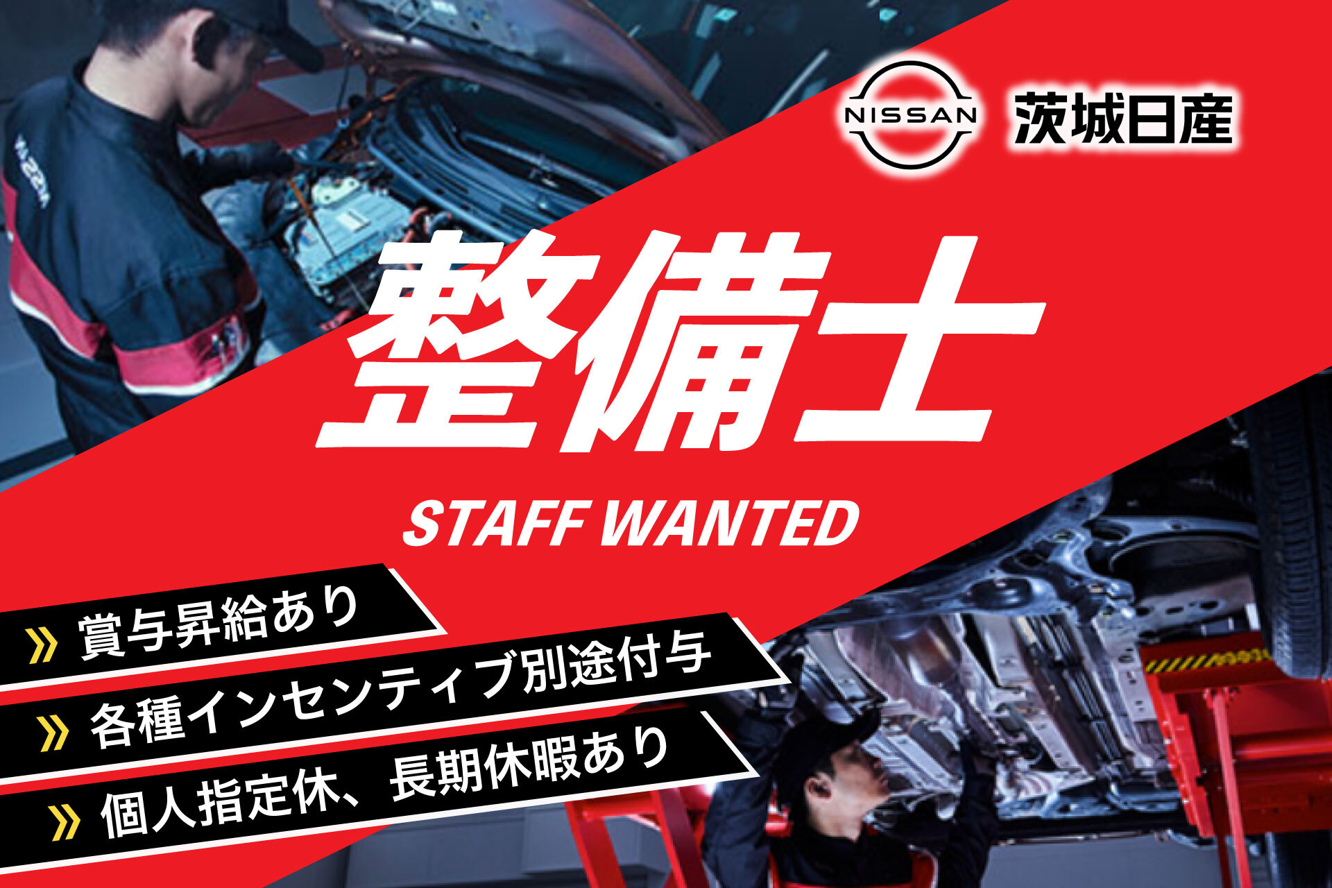 日産の整備士として、自動車の整備業務、これに付随する一切の業務をお任せいたします。